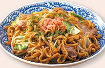 戦後まもなく作られ、昭和30年頃には子供のおやつとして10円単位で売られていた【黒石やきそば】太い平麺が特徴で、甘辛いソースがたっぷりのくせになる美味しさです。