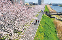 市の中央を流れる新川沿いには、およそ9キロメートルにわたって約1,000本の桜があります。ソメイヨシノや陽光など8種類の桜を楽しむことができ、ボランティア団体「新川千本桜の会」の協力を得て管理しています。