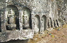 滝八幡神社の崖下で、隈戸川に面した10メートルの岸壁に彫られた仏像群。薬師如来や観音菩薩など37体。江戸時代中期頃のものと推定されています。