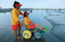 大洗サンビーチはユニバーサルビーチ(バリアフリービーチ)です。1997年から障がいのある方や、お年寄りが自由に安全に、そして快適に活動できるようにと始まりました。