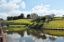 鎌倉時代、関東より下向した中原師員(なかはらのもろかず)によって築城されたといわれています。現在は、四季折々に美しい景色が楽しめ、園内には芝生広場や竹植物園もあります。