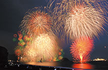 熊野大花火大会は、初精霊供養の花火を起源とし、約1万発を打ち上げる紀州最大の花火大会です。『鬼ヶ城』や海上での自爆花火など豊かな自然を活かした大迫力の名物花火が、夜空のみならず熊野灘をも舞台として繰り広げられます。鬼ヶ城の大岸壁に響き渡る轟音と、海上花火ならではの“足”の長さなど、他に類を見ない花火として、例年全国各地から十数万人の大観衆で賑わっています。