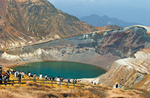 御釜は、蔵王・五色岳山頂にある火山湖。太陽の光で湖面の色が変わる不思議な現象を見ることができます。山頂から一望する御釜と仙台平野は、何度も見たい絶景です。