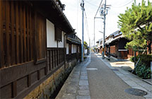 高取藩2万5千石の城下町として栄えた高取町のメインストリート。当時は500軒もの商家が軒を連ねたといい、今も低い軒先や連子窓といった古い家並みの随所に、往時の繁栄ぶりを偲ぶことができます。両脇に水路が流れる町筋の石畳には、阪神淡路大震災の復旧工事で出た石が活用され、所々に埋め込まれた薬草タイルを見て歩くのも楽しいスポットです。