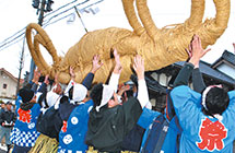 約300年前から無病息災、五穀豊穣を祈る行事として伝わる町無形文化財指定の伝統行事です。稲わらで作る大きなしめ縄(練馬)を数え19歳の若者が担いで集落内を練り歩き諏訪神社に奉納します。