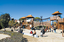 吉野ヶ里歴史公園には、物見やぐら、竪穴住居、高床倉庫等が復元され、弥生時代の雰囲気を体験できる空間となっており、園内は広大な敷地を4つのゾーンに分かれています。その中の一つ「古代の原ゾーン」では、広大な芝生の中に物見櫓風の大型遊具などがあり、体を動かして楽しむことができます。