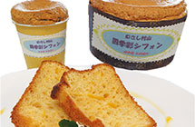 市内産の小麦粉に豆乳とおからを加えた生地に、お茶やみかん等の旬の市内産食材を練り込んで焼き上げたシフォンケーキです。