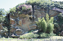 池野山地内にある国指定の天然記念物。石英粗面岩の巨岩が風雨に浸食されて、虫に喰われたような無数の穴が岩全体に刻まれています。